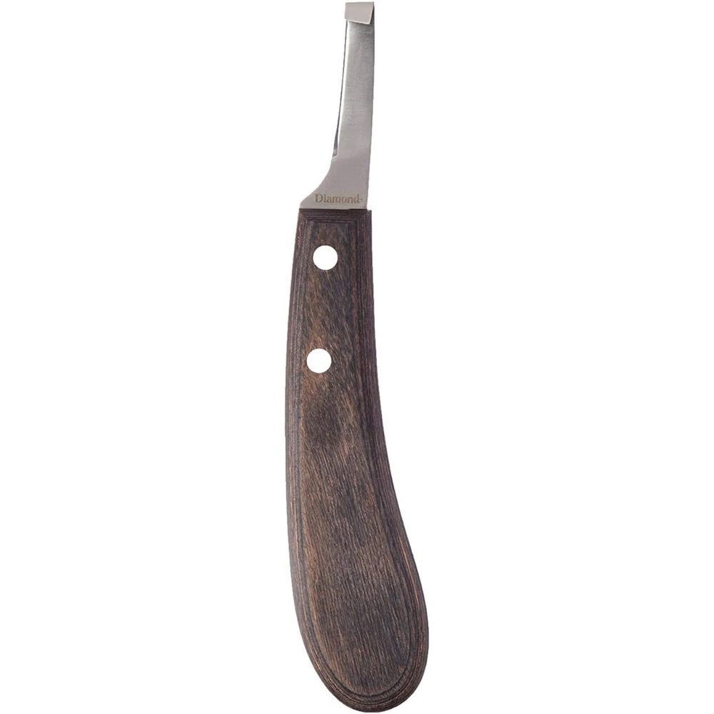 The Diamond Farrier Right Handed Narrow Hoof knife removes excess sole and trims the frog quickly and easily. The stainless steel blade maintains a sharp edge for clean, fast cuts. Features a hardwood handle for a comfortable grip.